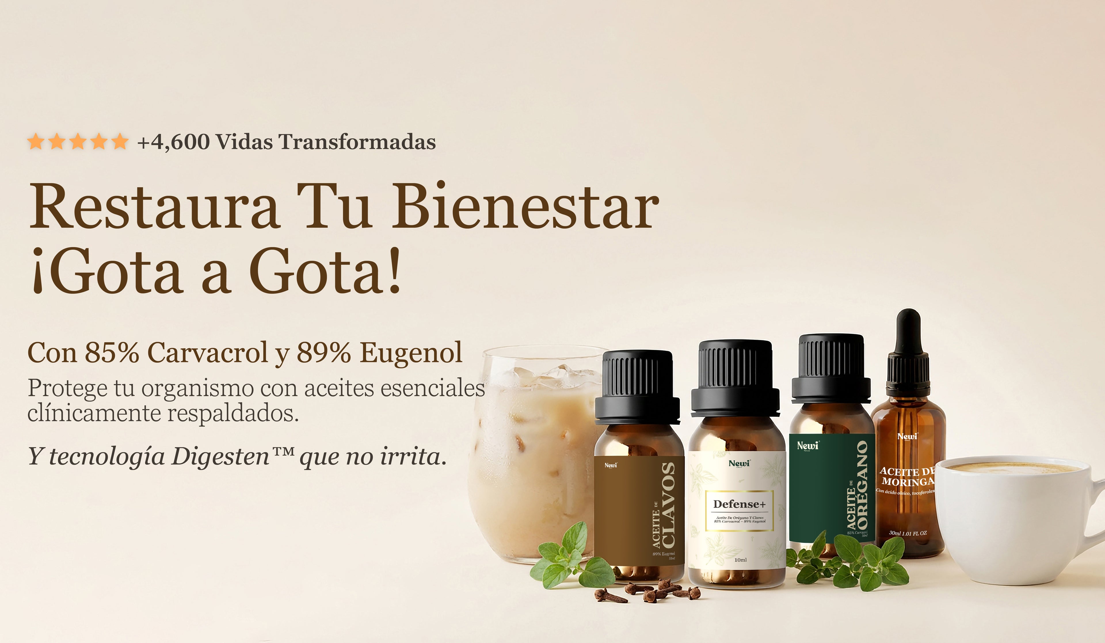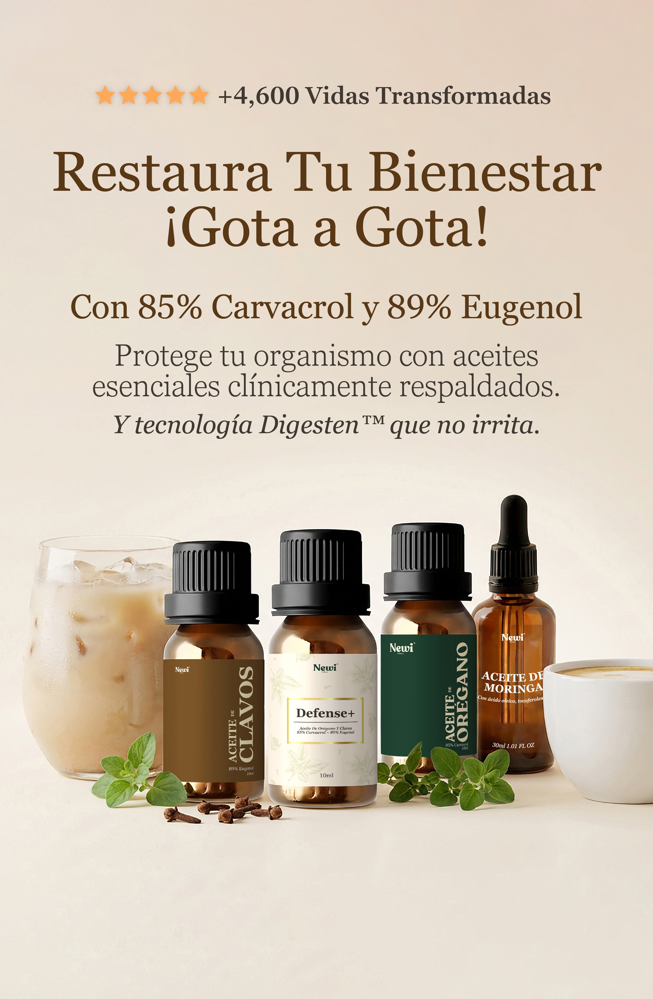 Defense+ es nuestra fórmula combinada que une lo mejor de ambos aceites (Orégano 85% + Clavo 89%). Es perfecto para fortalecer el sistema inmunológico de forma integral, proteger contra infecciones y mantener una salud general óptima. Si buscas protección completa, Defense+ es tu mejor opción.