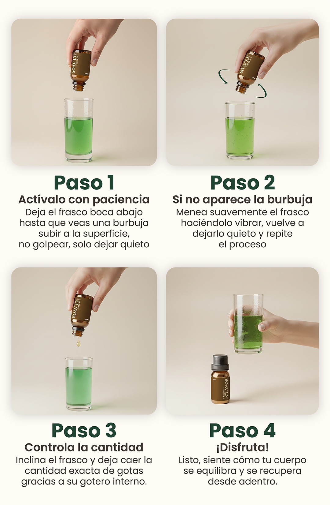 Concentrado puro de clavo al 89% de eugenol—el nivel más alto disponible en Colombia. Tres gotas son suficientes: elimina bacterias en boca, lengua y estómago que causan mal aliento persistente, alivia dolor dental al instante y protege tus encías naturalmente. La solución que ataca la raíz del problema, no solo lo disfraza.